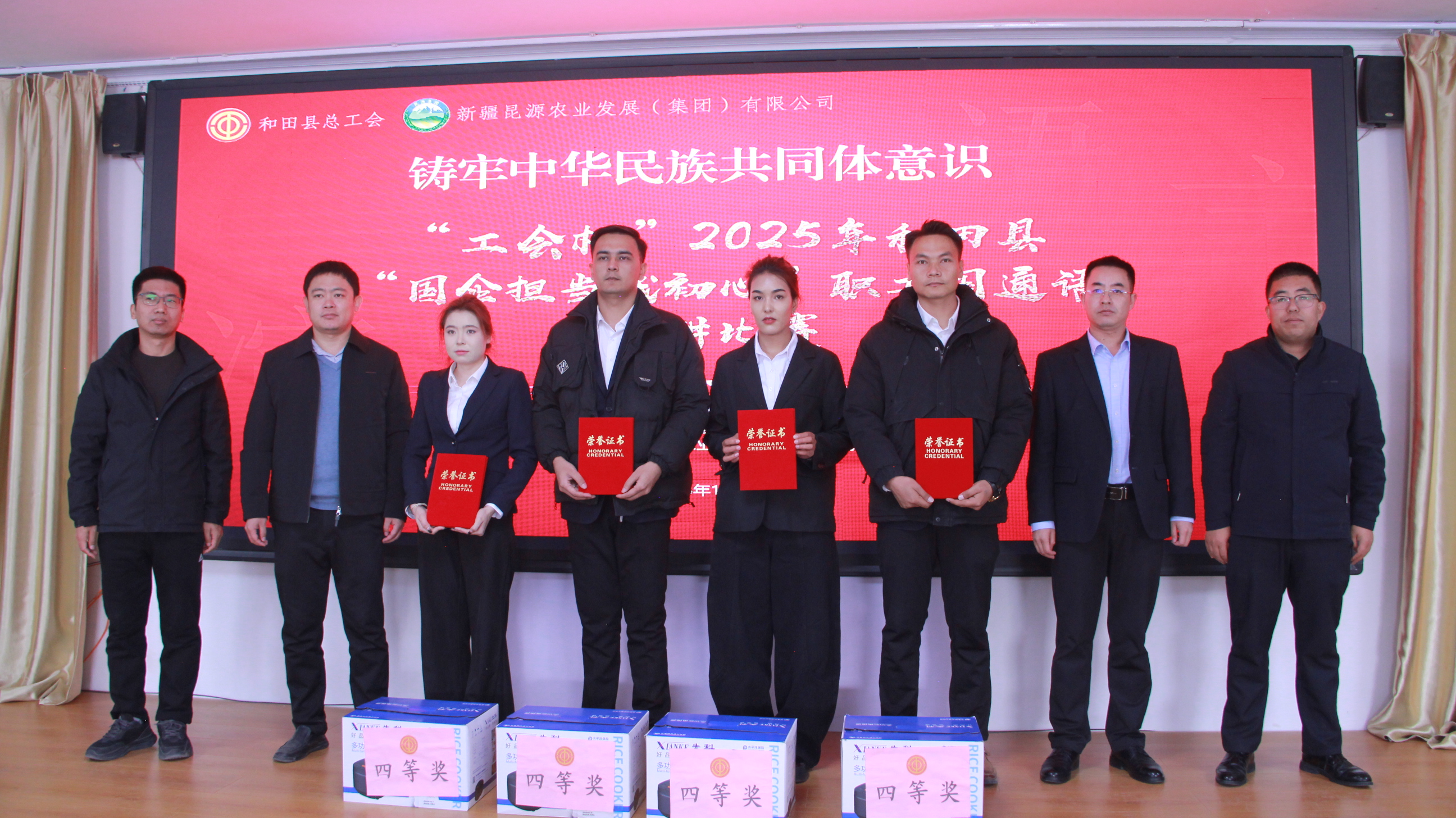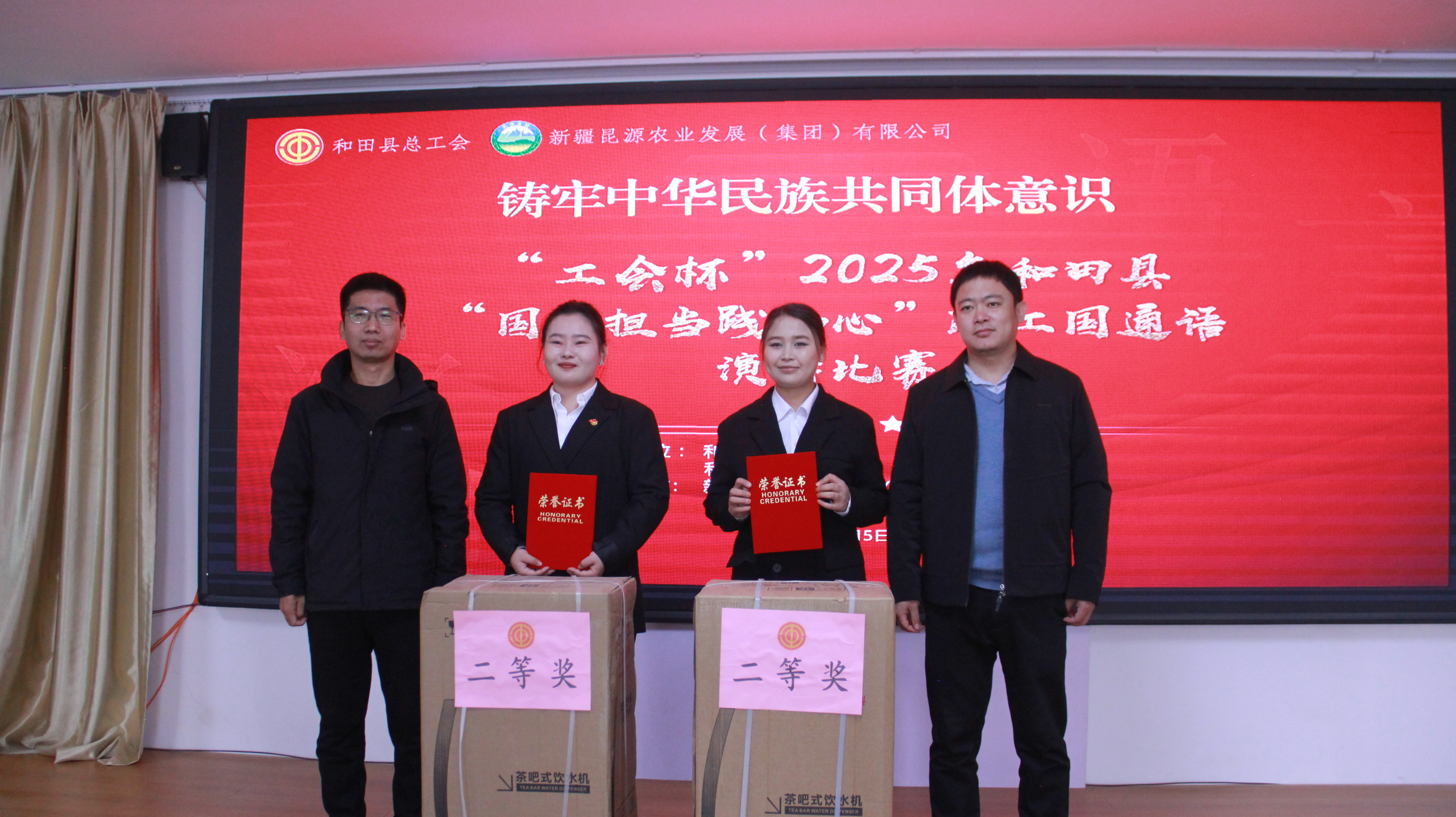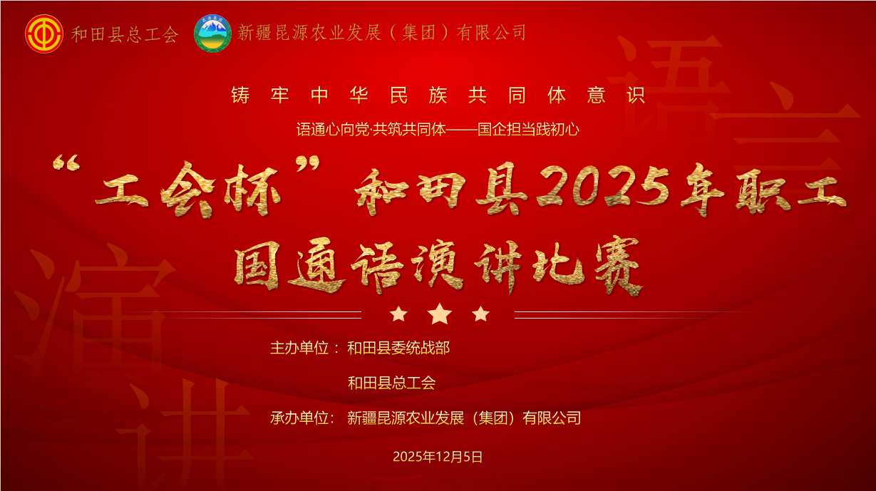 为提升职工国家通用语言文字水平,展现新时代职工综合素养与精神风貌,2025 年 12 月 5 日上午,由和田县委统战部、和田县总工会主办,新疆昆源农业发展(集团)有限公司承办的2025年 “工会杯”和田县职工国通语演讲比赛在公司大会议室顺利举行。公司的24名职工选手齐聚一堂进行最终决赛,以语言为桥梁,传递奋斗热忱,抒发职业担当。